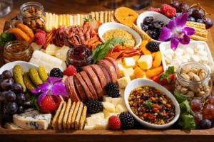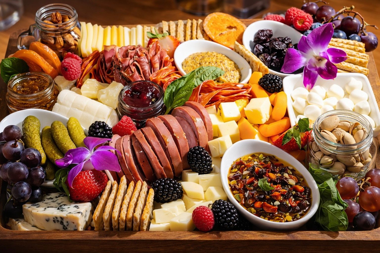 Grand Charcuterie BoardVariety of jams, spreads, preserves, fresh and dried fruits, assorted crackers, cheeses, meats, nuts, pickles and olives. (Feeds six) |