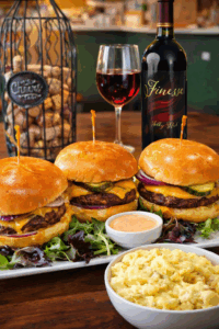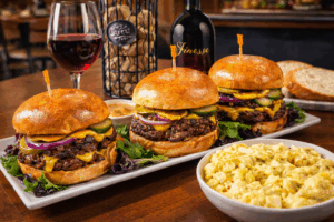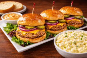JUMBO Beef Char-Broiled Slider Platter(3) – Charbroiled beef patties topped with medium cheddar cheese, thinly sliced red onions, and spicy pickle slices. Served on buttery brioche buns. Comes with Carin’s special burger sauce and a side of creamy potato salad. |