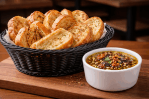 Loaded Oil Dipping Bowl w/ Assortment of BreadsOlive oil, balsamic vinegar, garlic, kalamata olives, sun-dried tomatoes & seasonings.) Breads (French, Italian & Garlic Crostini) |