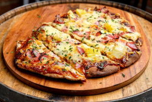 BBQ Hawaiian Flatbread PizzaHavarti cheese, Parmesan cheese, barbecue sauce, |