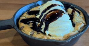 Chocolate Chip Cookie SkilletA warm, gooey, thick chocolate-chip cookie drizzled in chocolate fudge and with an optional scoop of premium vanilla ice-cream. |